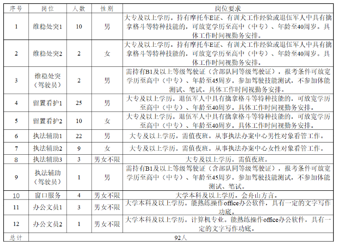 計(jì)劃招聘警務(wù)輔助人員92名,具體崗位、招聘人數(shù)、資格條件詳見(jiàn)《舟山市公安局2022年第七批警務(wù)輔助人員招聘計(jì)劃表》。