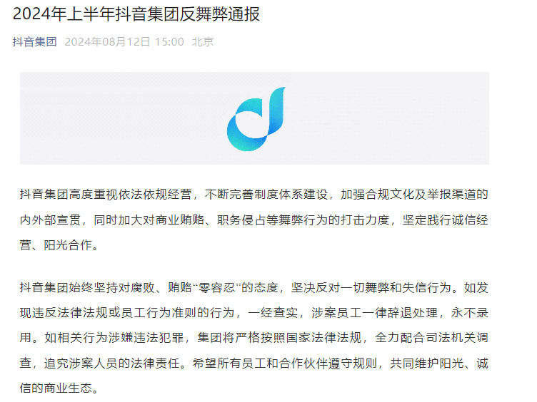 8月12日,抖音集團公眾號發(fā)布2024年上半年抖音集團(即字節(jié)跳動)反舞弊通報。