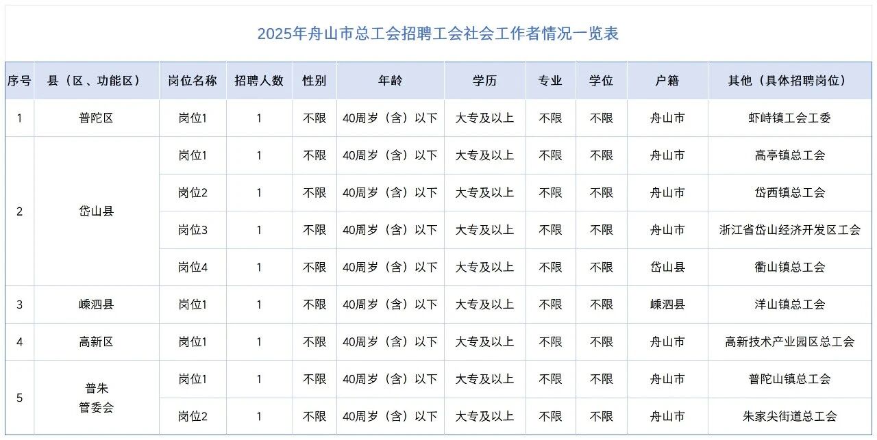 本次計(jì)劃招聘鄉(xiāng)鎮(zhèn)(街道、開發(fā)區(qū)、園區(qū))工會(huì)社會(huì)工作者9名,涉及 5個(gè)縣(區(qū)、功能區(qū)) 9 個(gè)鄉(xiāng)鎮(zhèn)(街道、開發(fā)區(qū)、園區(qū))。各招聘單位、崗位、人數(shù)、具體條件及其他情況詳見附件《2025年舟山市總工會(huì)招聘工會(huì)社會(huì)工作者情況一覽表》。