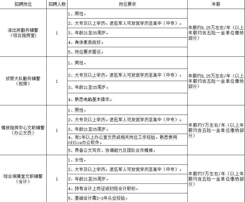 警務(wù)輔助人員年薪參考上述表格。對錄用擬聘用人員簽訂聘用合同,實(shí)行合同管理。年薪均包含五險一金單位繳納部分。報名聯(lián)系方式